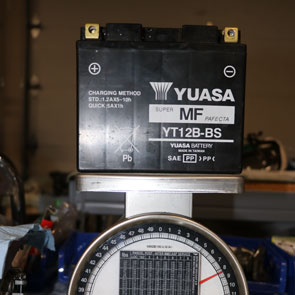 The Official Yuasa lead acid battery weight is 7.6 lbs. and but my unofficial scale had it closer to 8.5 lbs.